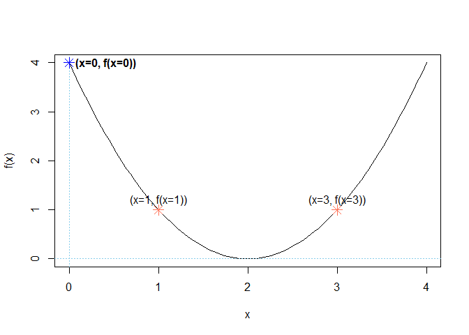 text(c(1, 3), c(f(1), f(3)), labels = c("(x=1, f(x=1))", "(x=3, f(x=3))"), pos = 3, font = 2)