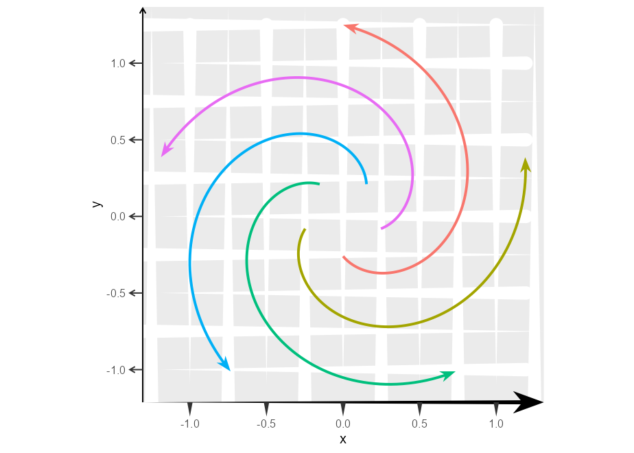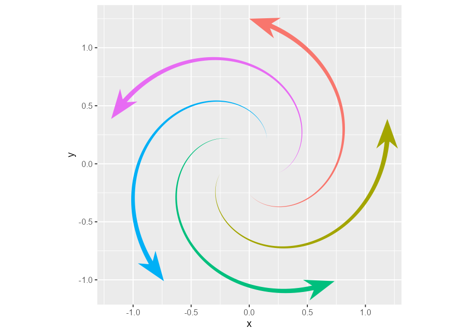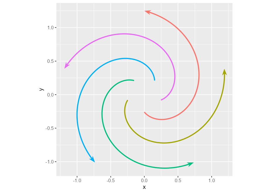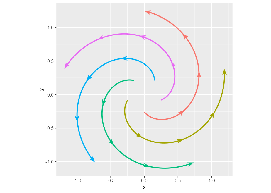 p <- ggplot(whirlpool(5), aes(x, y, colour = group)) +