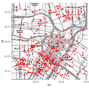 # 2 houston, texas waco, texas 295079 295. 183. 10112 169. 2.81 drivingA few years ago Google has changed its API requirements, and ggmap users are now required to register with Google. From a user’s perspective, there are essentially three ramifications of this: