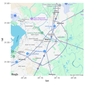 get_googlemap("waco texas", zoom = 12, maptype = "hybrid") |> ggmap()