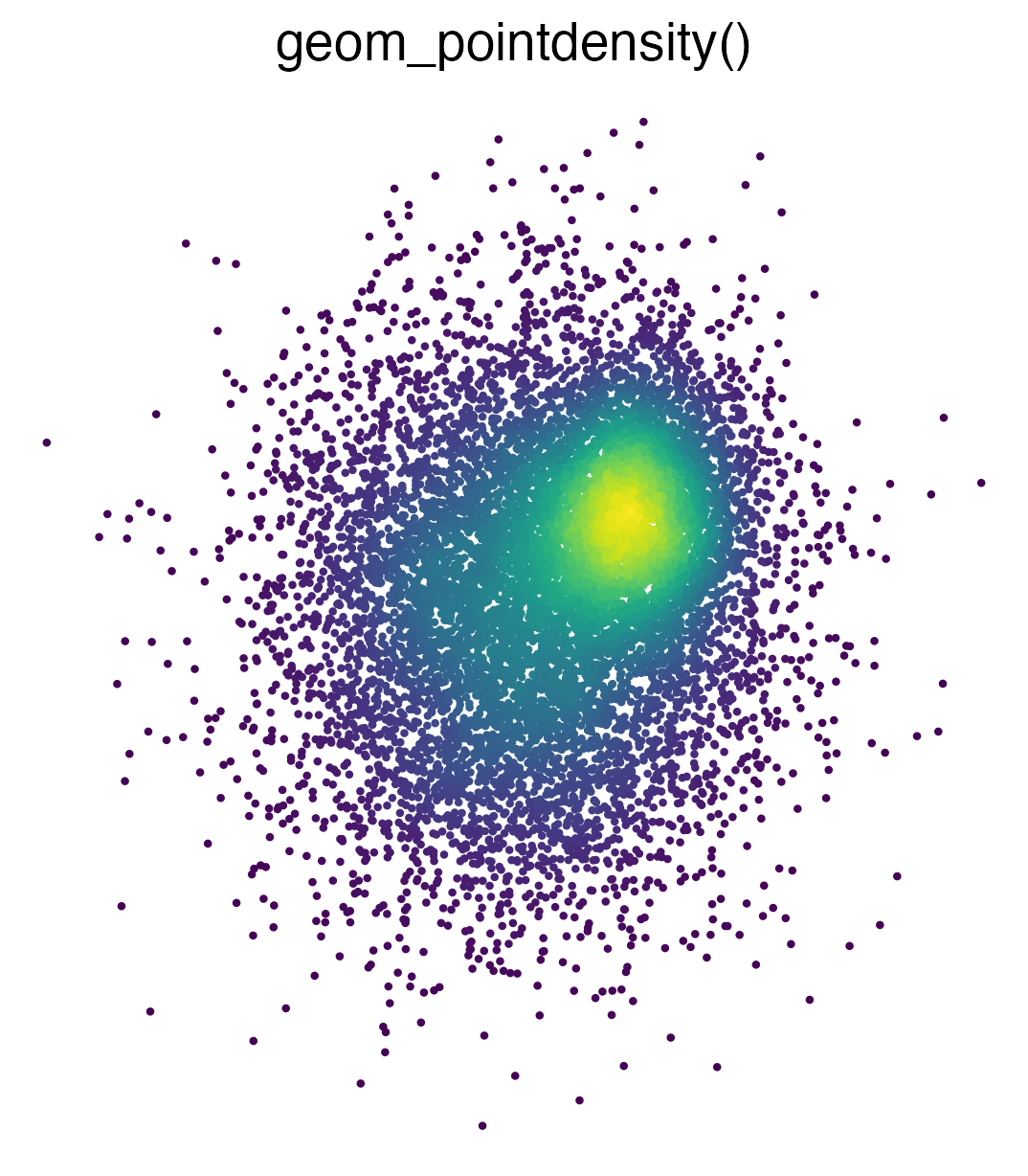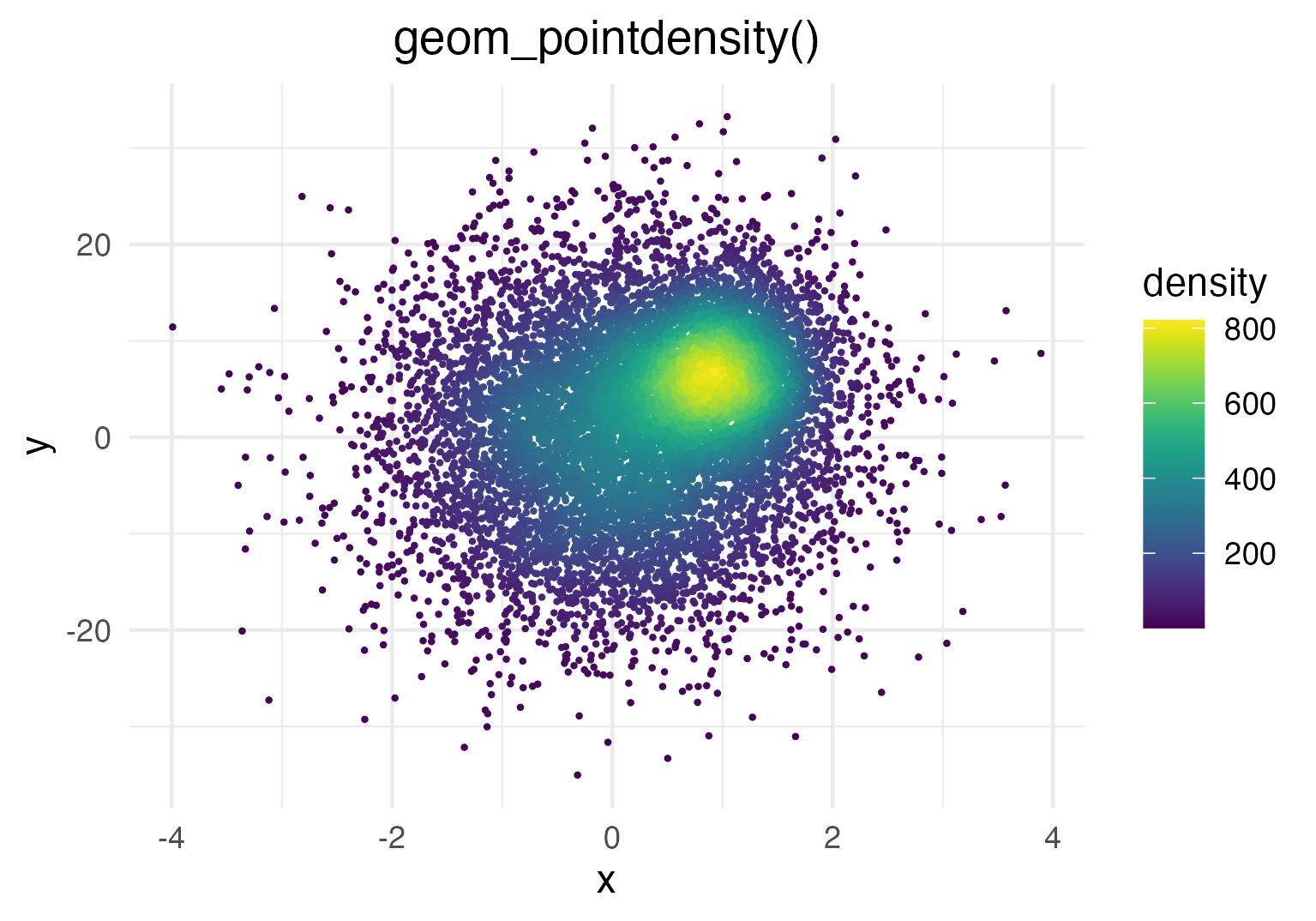 geom_pointdensity() aims to solve this problem by combining the best of both worlds: individual points are colored by the number of neighboring points. This allows you to see the overall distribution, as well as individual points.