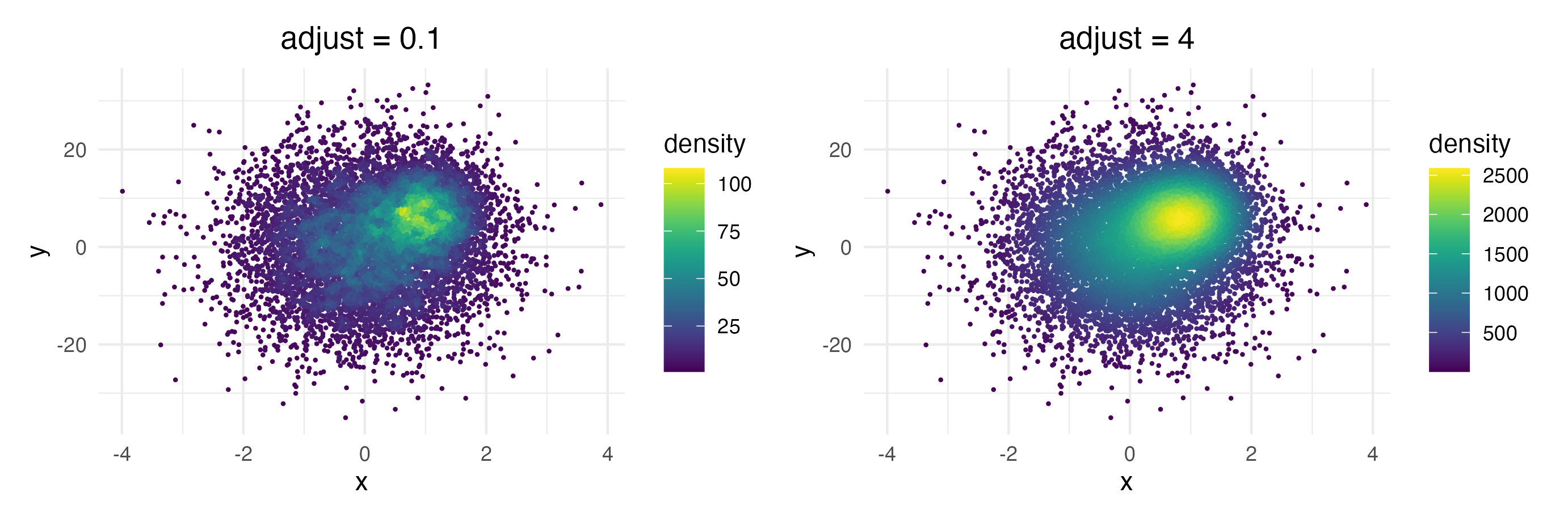 Each point is colored according to the number of neighboring points. The distance threshold to consider two points as neighbors (smoothing bandwidth) can be adjusted with the adjust argument, where adjust = 0.5 means use half of the default bandwidth.