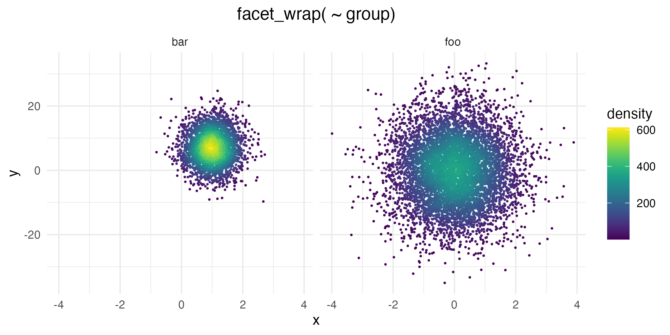 Even though the foo data group is not as dense as bar overall, this plot uses the whole color scale between 0 and 1 in both facets.