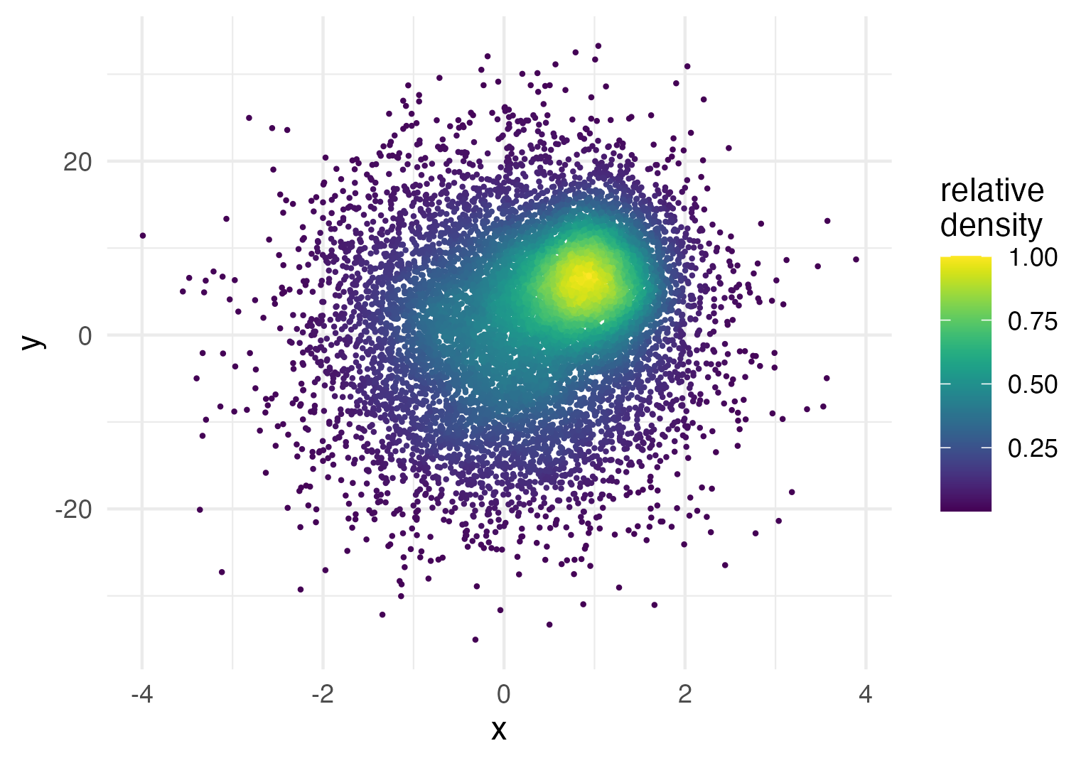 Since plotting the relative density is a common use-case, we provide a little shortcut. Instead of the solution above you can simply use after_stat(ndensity). This is especially useful when facetting data, since sometimes you want to inspect the point density separately for each facet: