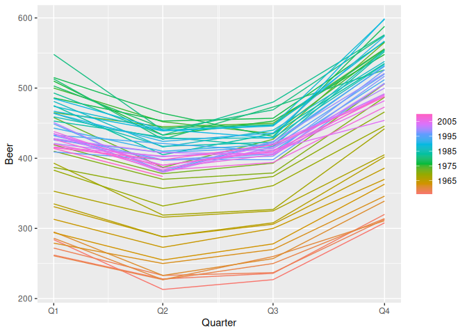 To view the shape of the annual seasonal pattern, it is useful to use a seasonal plot which shows time cyclically on the x-axis. This makes it easier to identify the peaks, troughs, and overall shape of the seasonality. A seasonal plot is created from a tsibble with the gg_season() plot helper function.