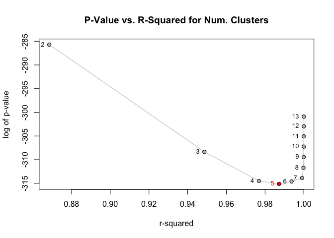 Note that greencut() also includes the r-squared and p-value for that particular clustering level as vector attributes. If you want a different cut point, but would still like to have these attributes, you can override automatic selection by specifying either k (number of clusters) or h (height, or 1 - r-squared):
