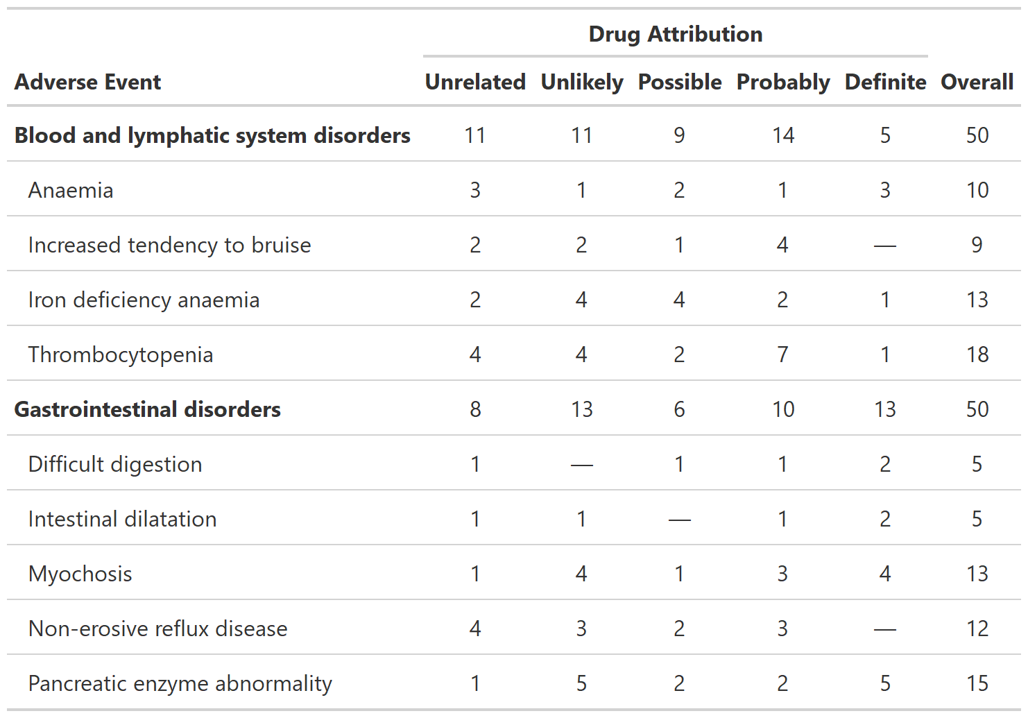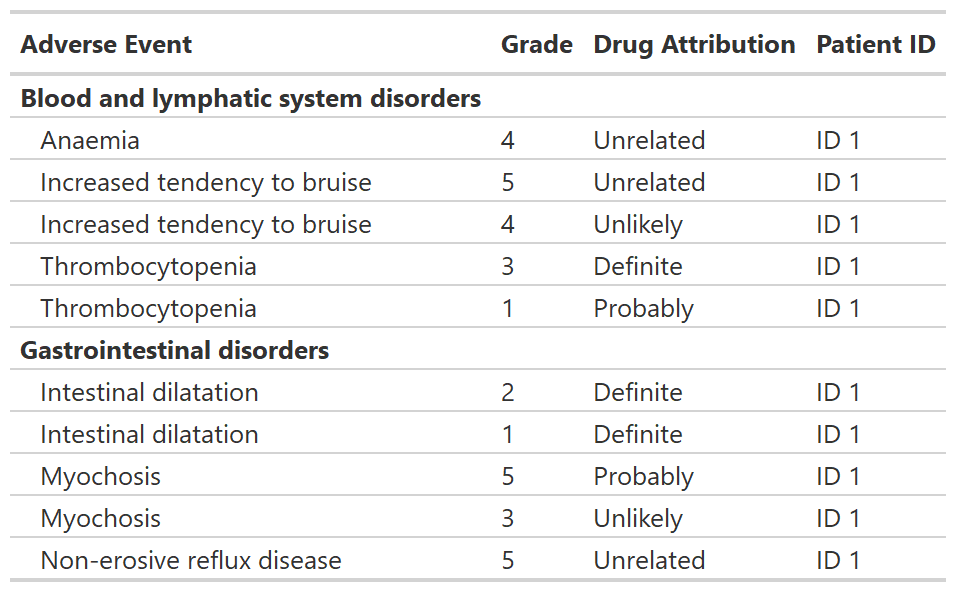 select(system_organ_class, adverse_event, grade, drug_attribution, patient_id) |>
