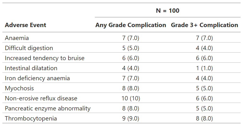 tbl_ae() counts one AE per subject by maximum grade; percentage statistics are provided by default with the denominators reflecting the number of patients in the study.