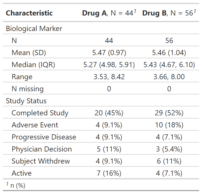 tbl_reg_summary() creates a data summary table often seen in regulatory submissions.