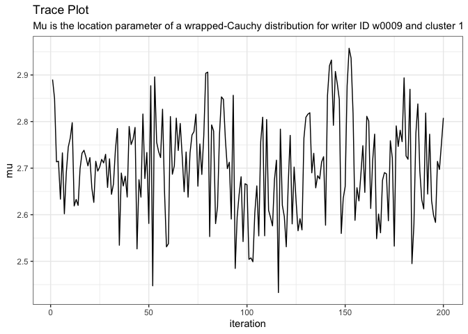 #> [1] "Mu is the location parameter of a wrapped-Cauchy distribution for writer ID w0009 and cluster 1"View a trace plot of a variable.