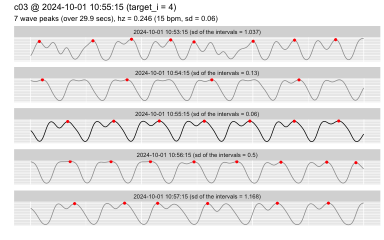 #> # ℹ 1,190 more rowsThe timestamps corresponding to the peaks identified in each split window can easily be extracted.