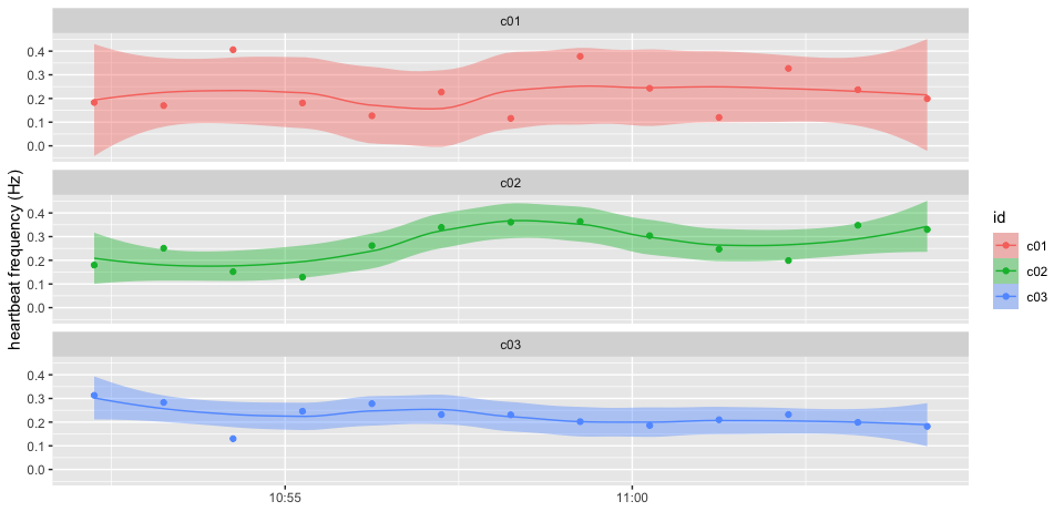 pulse_plot(heart_rates[heart_rates$id %in% c("c01", "c02", "c03"), ])