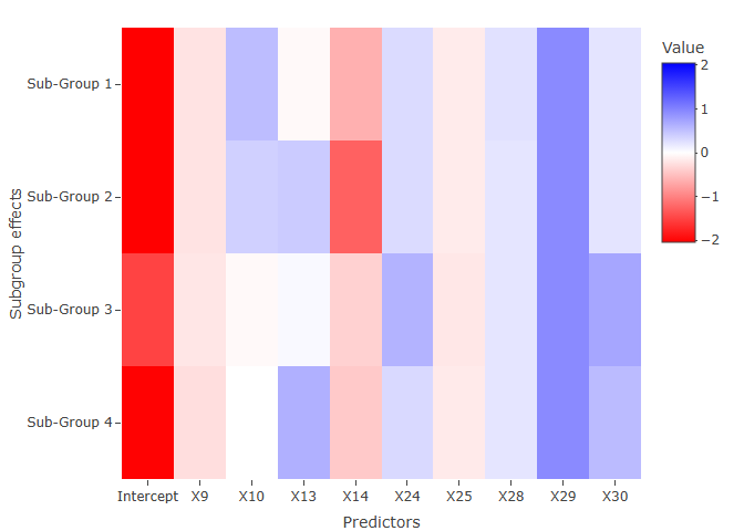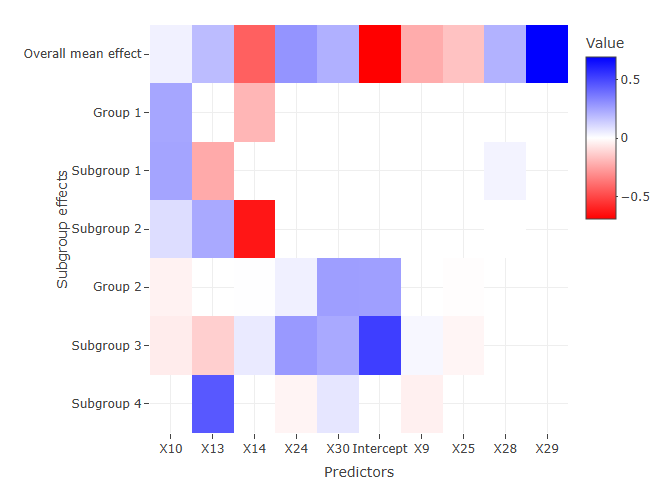 By specifying the type = “coefficients”, we plot all non-zero coefficient including the overall mean, group-specific, and subgroup specific.