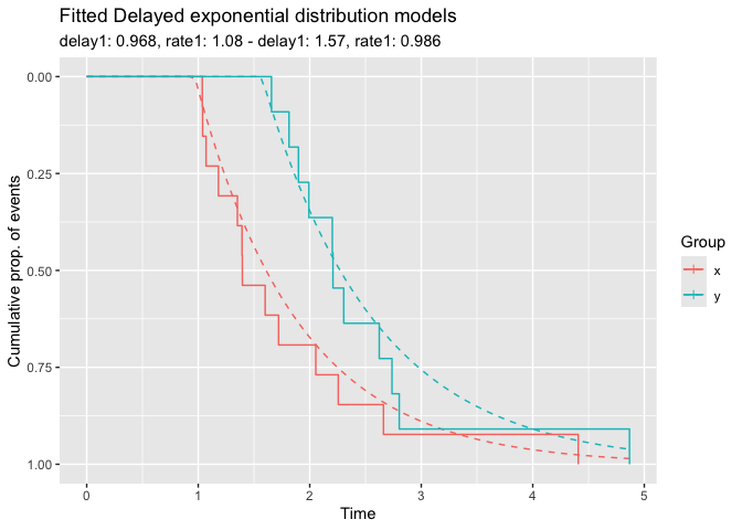 The incubate-package provides the delayed exponential distribution as a special case of the delayed Weibull distribution. We draw random samples corresponding to two groups with different model parameters.
