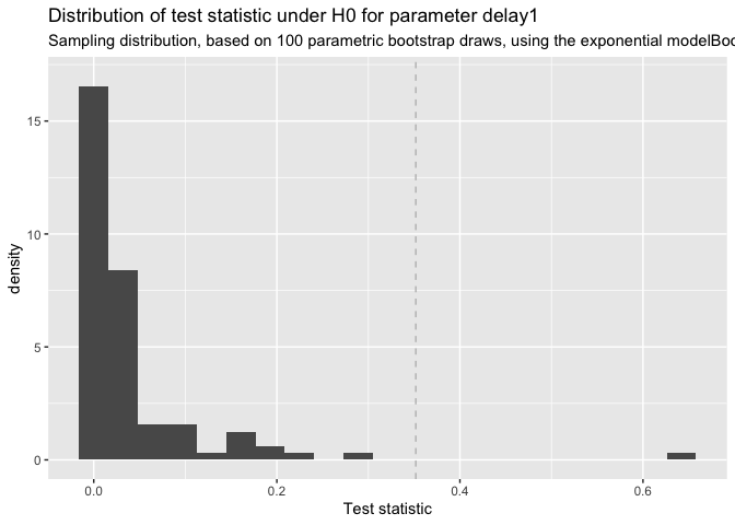 Inference on the model parameters is possible through confint for bootstrap confidence intervals and delay_test for parameter comparisons in a two group setting.