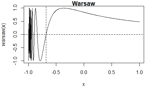 #> 0.5 7.404e-11The Warsaw function \(w(x) = I(x > -1)\left(1 + \sin\left(\frac{1}{1+x}\right)\right)-1\) has multiple roots.