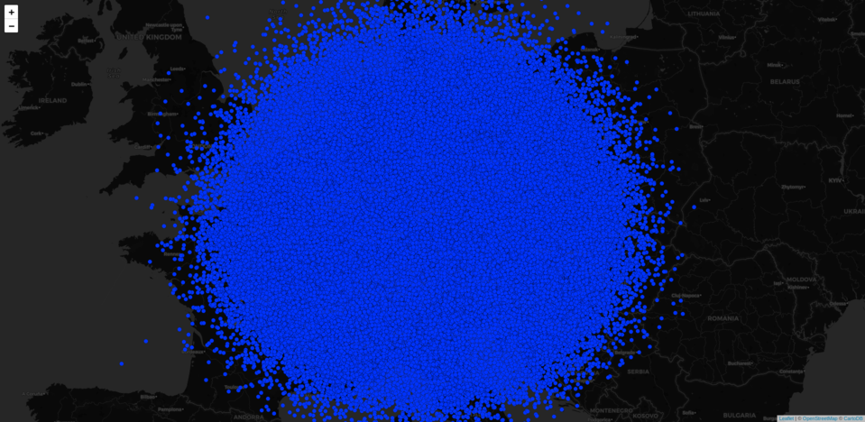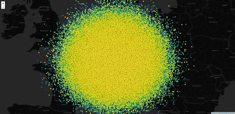 Given it’s name, leafgl is intended to fully integrate with the leaflet package, though it is very likely that it won’t be a 1:1 replacement for the respective leaflet::add* functions. For example, given the intention to render/visualise as many features as possible we need to make a compromise on what additional information we allow to be part of the rendering. So far, we allow coloring of features and popups based on one column of the feature attributes, hence you cannot provide your own popup content. This may seem drastic, but all this information is costly both in terms of performance/speed and memory. In the end, who wants to wait for a map that the browser isn’t able to render anyway…