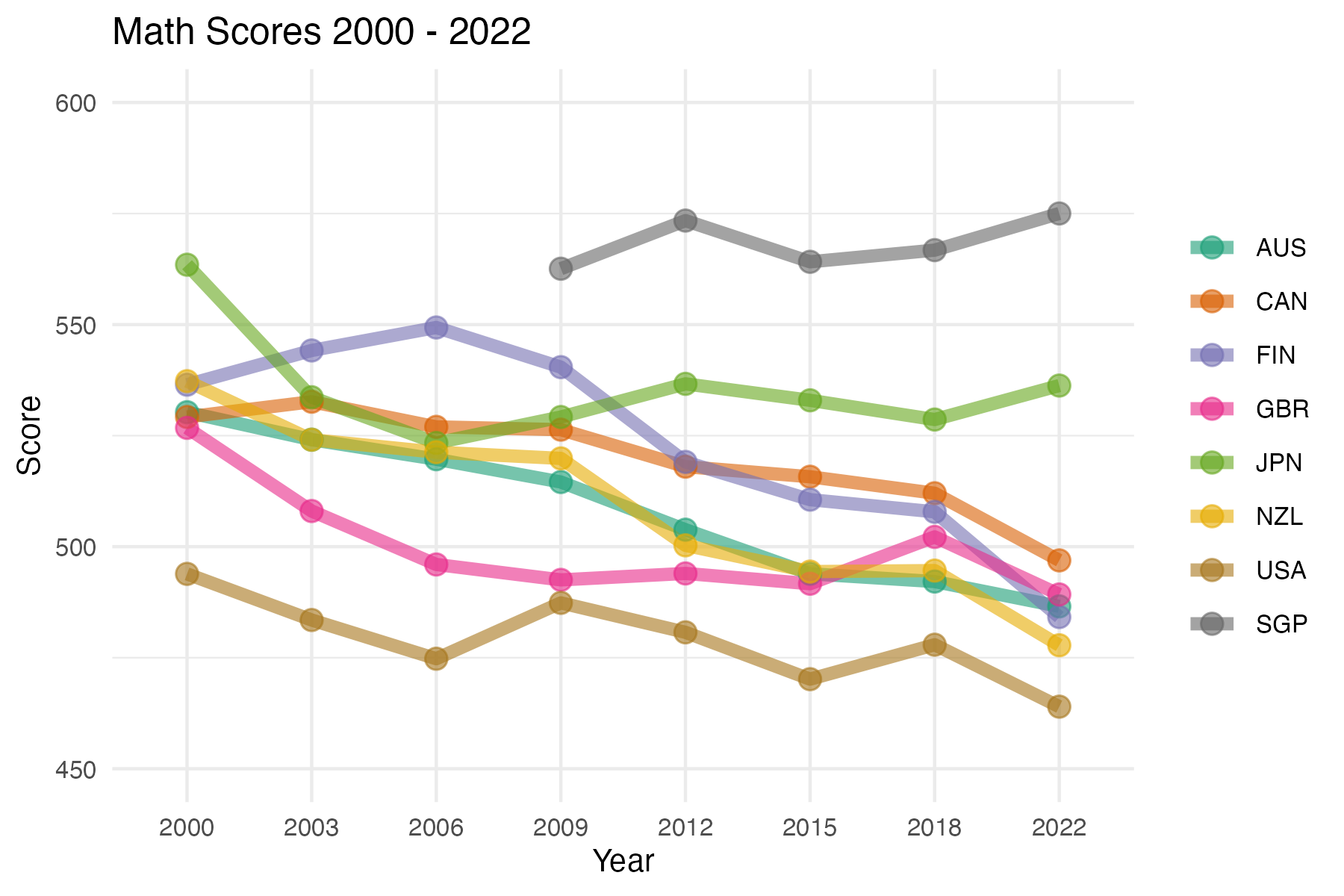 In the plot shown below, shows the weighted mean of mathematics scores of these 15 year old students for a few selected countries over the available years.