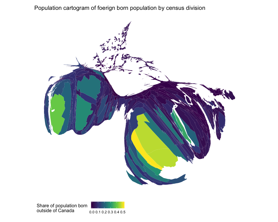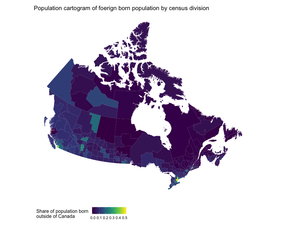 Let’s plot the share of individuals born outside of Canada in each census division as a standard choropleth map then as a population cartogram.