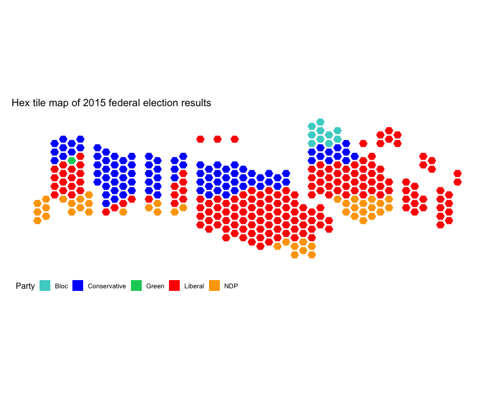 ggtitle("Hex tile map of 2015 federal election results")