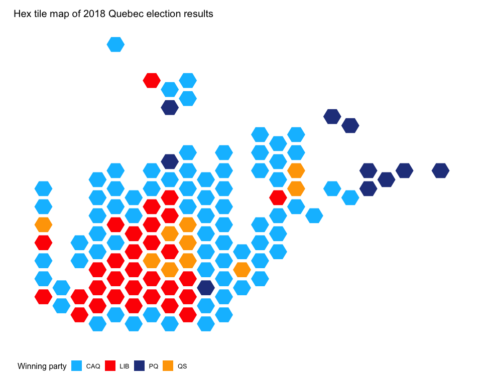ggtitle("Hex tile map of 2018 Quebec election results")