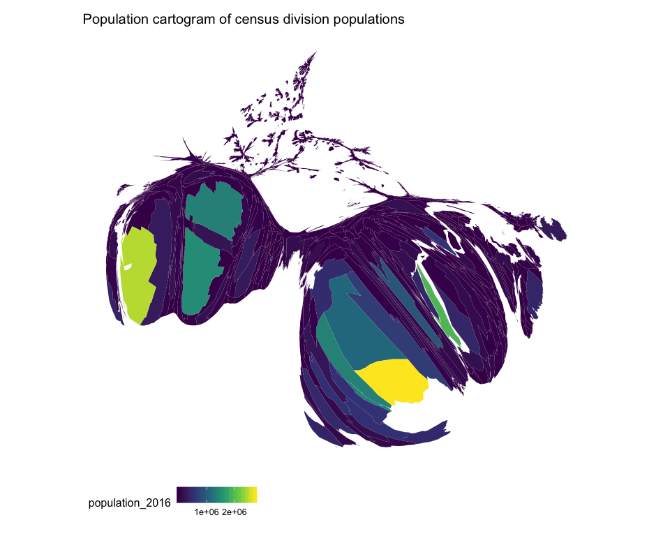 ggtitle("Population cartogram of census division populations")