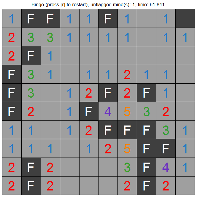 remotes::install_github("zhuxr11/mineSweepR")Below are two screenshots of the mine sweeper game. While game is in progress, there are some tile types and marks:
