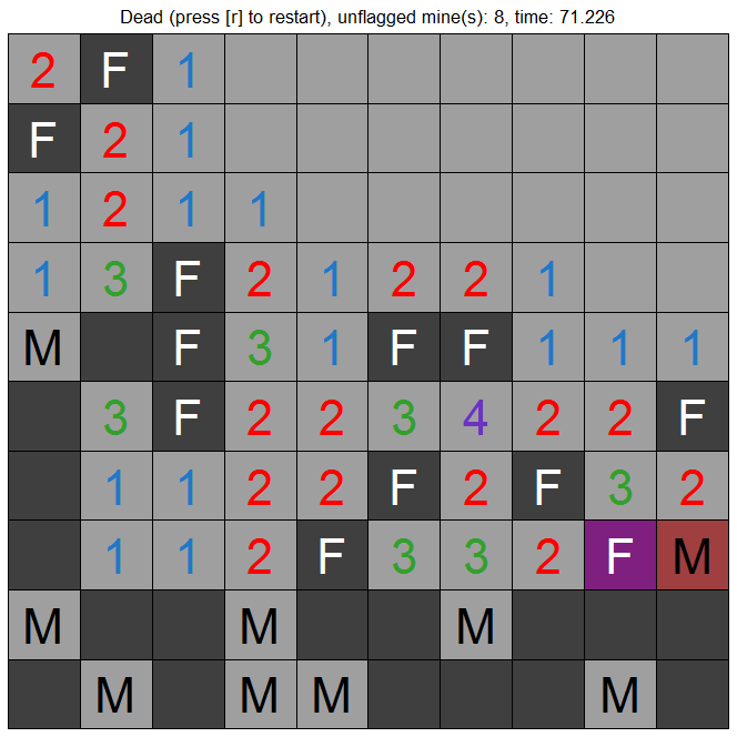 Strings as colors for unmasked tiles / masked tiles / mine-triggering tile / wrongly flagged tiles. |