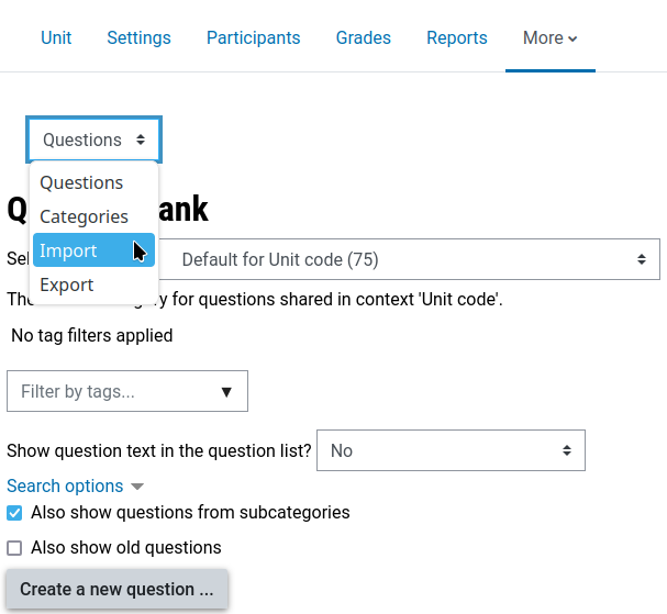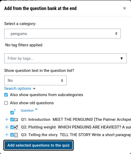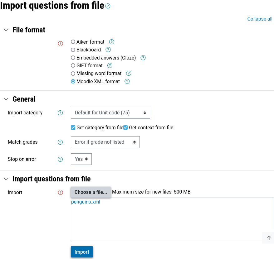 ---In this case the questions will be imported into the ‘penguins’ category, with only 1 replicate for each question (the default).
