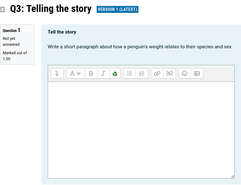 In this example, a description question is used to provide background context about the Palmer Archipelago penguins (along with a lovely illustration and preview of the dataset). Both the image and table will be bundled into the XML and imported as part of the Moodle quiz question.