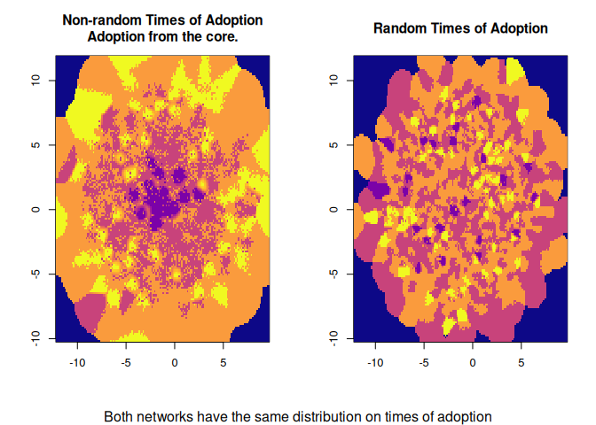image(dm0, col=col, main="Non-random Times of Adoption\nAdoption from the core.")