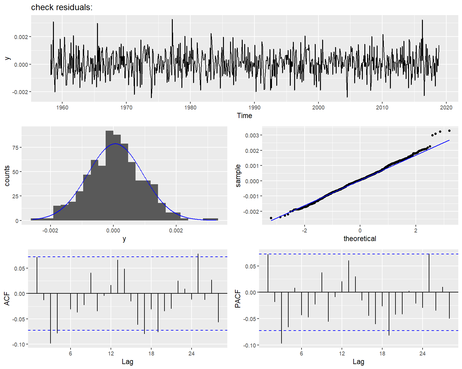check_residuals(model,unit_root = "adf",normality = "rp",plot = TRUE)