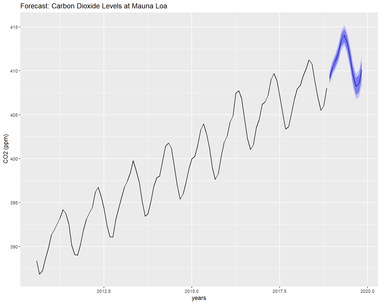 main = "Forecast: Carbon Dioxide Levels at Mauna Loa")