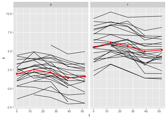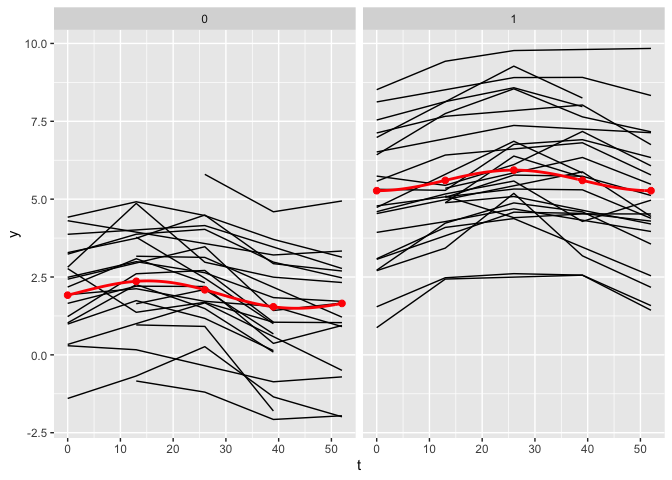 The plsmmLasso package offers flexibility; if the nonlinear functions do not differ between groups, the timexgroup argument can be set to FALSE. Below, we simulate a dataset where the nonlinear functions are the same and fit the data accordingly.