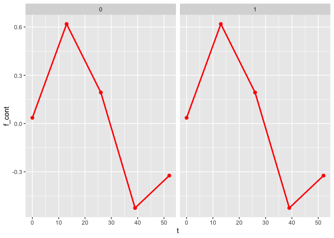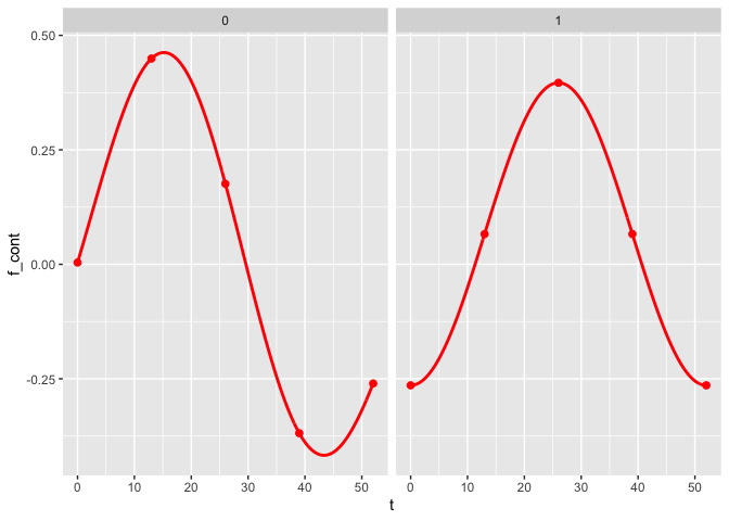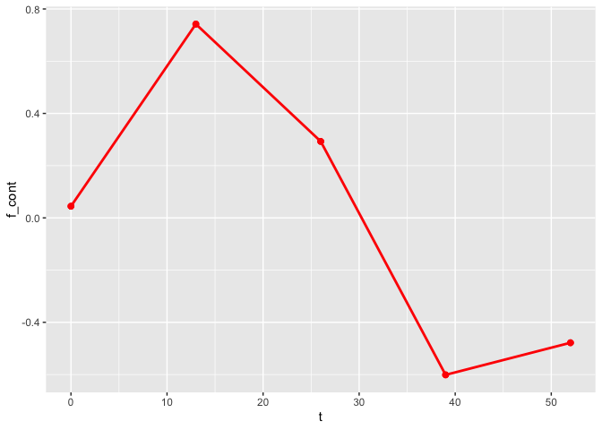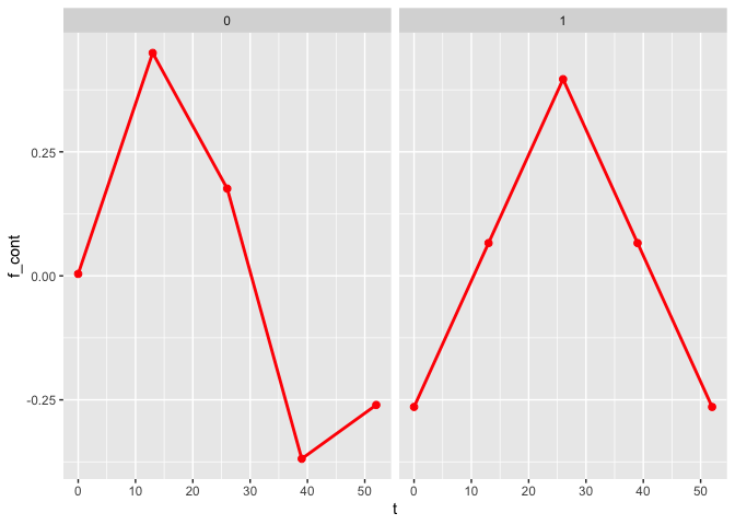 The plot_fit() function allows for the visualization of the estimated mean trajectories as well as the estimate of the nonlinear functions. By default, only the observed time points are being used. To use continuous time points, the argument predicted can be set to TRUE.