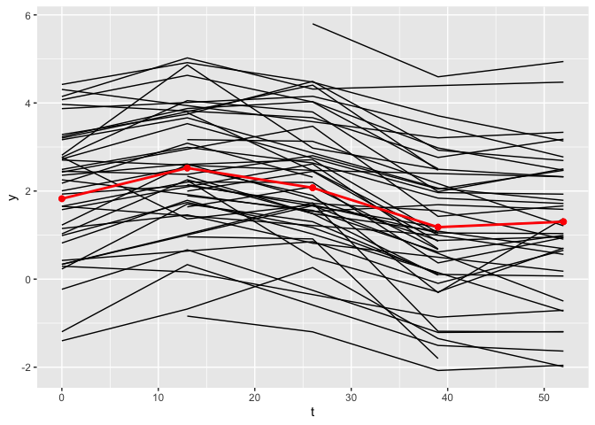 It is also possible not to use any grouping variable for the name_group_var argument. Here, we simulate a dataset without the effect of a grouping variable, resulting in no difference in the height of the overall mean trajectories and using the same nonlinear functions.