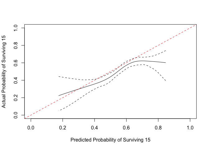 #> Validation of Predicted Survival at Time= 15     n= 1000 , events= 1000