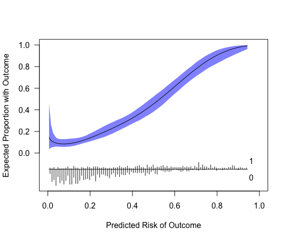 plot(cc, xlab="Predicted Risk of Outcome", ylab="Expected Proportion with Outcome", fillcol = "blue", ideallty = 0)