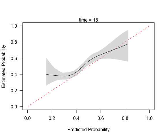 #> Calibration metrics based on a calibration curve estimated for a time-to-event outcome (time = 15) via a restricted cubic spline (see ?rms::rcs) using complementary log-log transformed predicted probabilities.