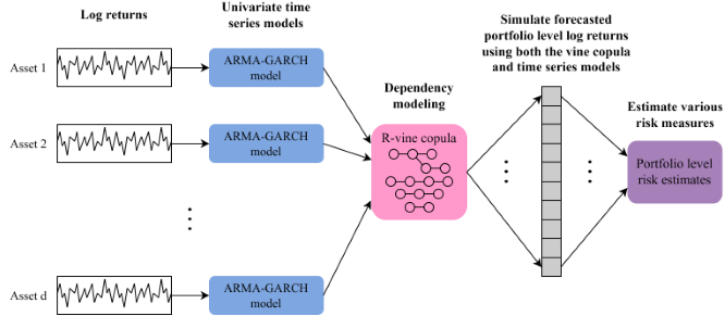 devtools::install_github("EmanuelSommer/portvine")The implemented algorithms for the unconditional as well as conditional portfolio level risk measure estimation are based on my masters thesis at the chair of Mathematical Statistics at the TUM which you can find here. The general idea of the unconditional risk measure estimation approach is summarized in the flowchart below for a \(d\)-dimensional portfolio.
