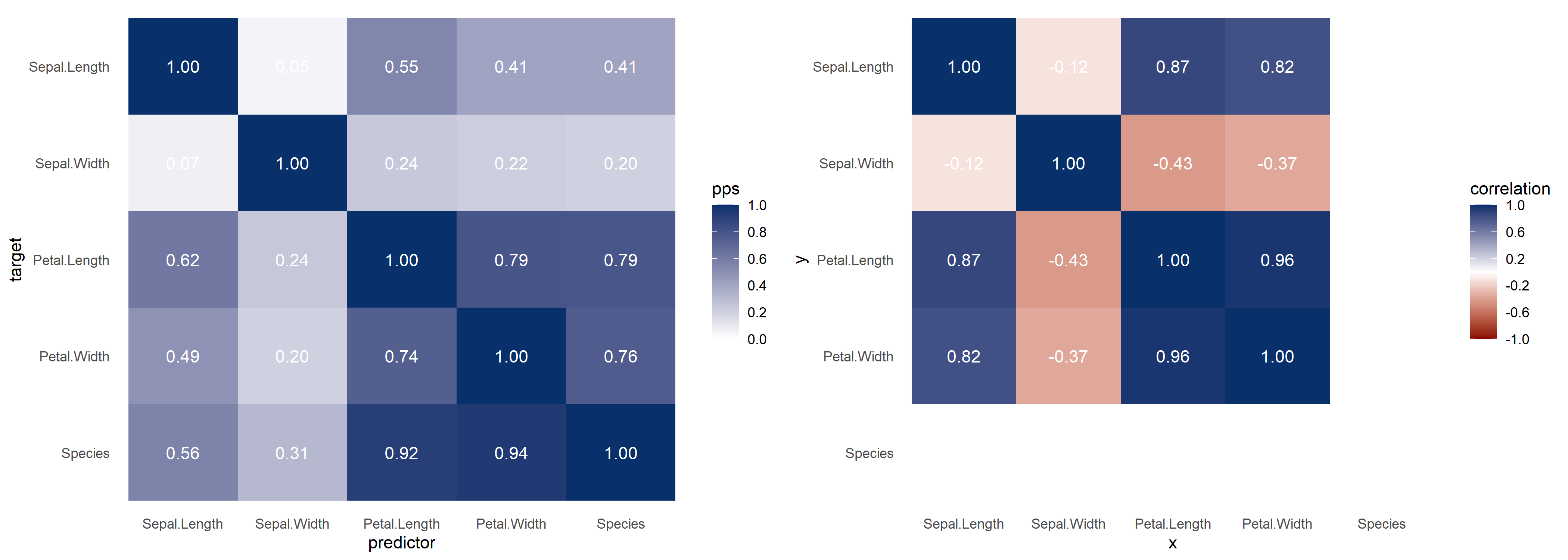 #> 14  Petal.Width Petal.Length            predictive power score 0.79175121