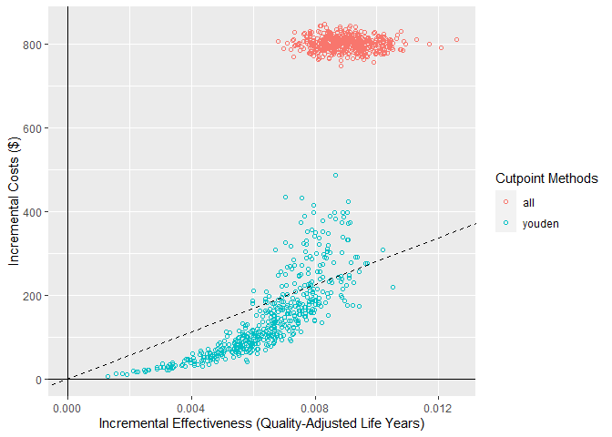 From this plot, we can see that both the treat-all and model-guided decision lead to more QALYs than treating nobody (because more patients are receiving an effective treatment) but that the treat-all strategy is not cost-effective according to our cost-effectiveness plane (based on a willingness to pay of $28,033). Based on this, we would conclude that the hypothetical model-guided decision support system would be likely to be cost-effective should we be able to develop a model with this level of discrimination for this specific healthcare problem/context.