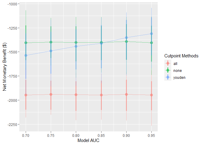 )These simulations can be interpreted as a range of hypothetical situations under different levels of model performance within our specific healthcare setting. We can visualise how this change may affect preferences between the model-guided strategy versus a treat-all or treat-none strategy — in other words, using the model to determine who should get treatment, rather than everyone or no one.