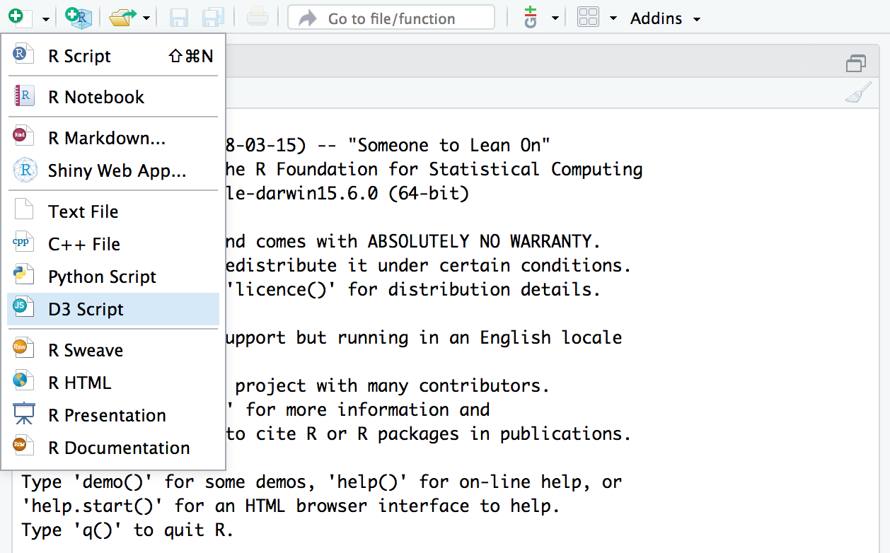 devtools::install_github("rstudio/r2d3")Next, install the preview release of RStudio v1.2 of RStudio (you need this version of RStudio to take advantage of various integrated tools for authoring D3 scripts with r2d3).