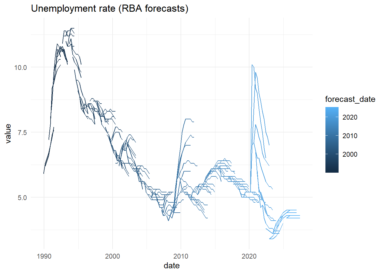 And you can also easily get the RBA’s public forecasts - from 1990 to present - and visualise those. Here’s every public forecast of the unemployment rate the RBA has made over the past three decades: