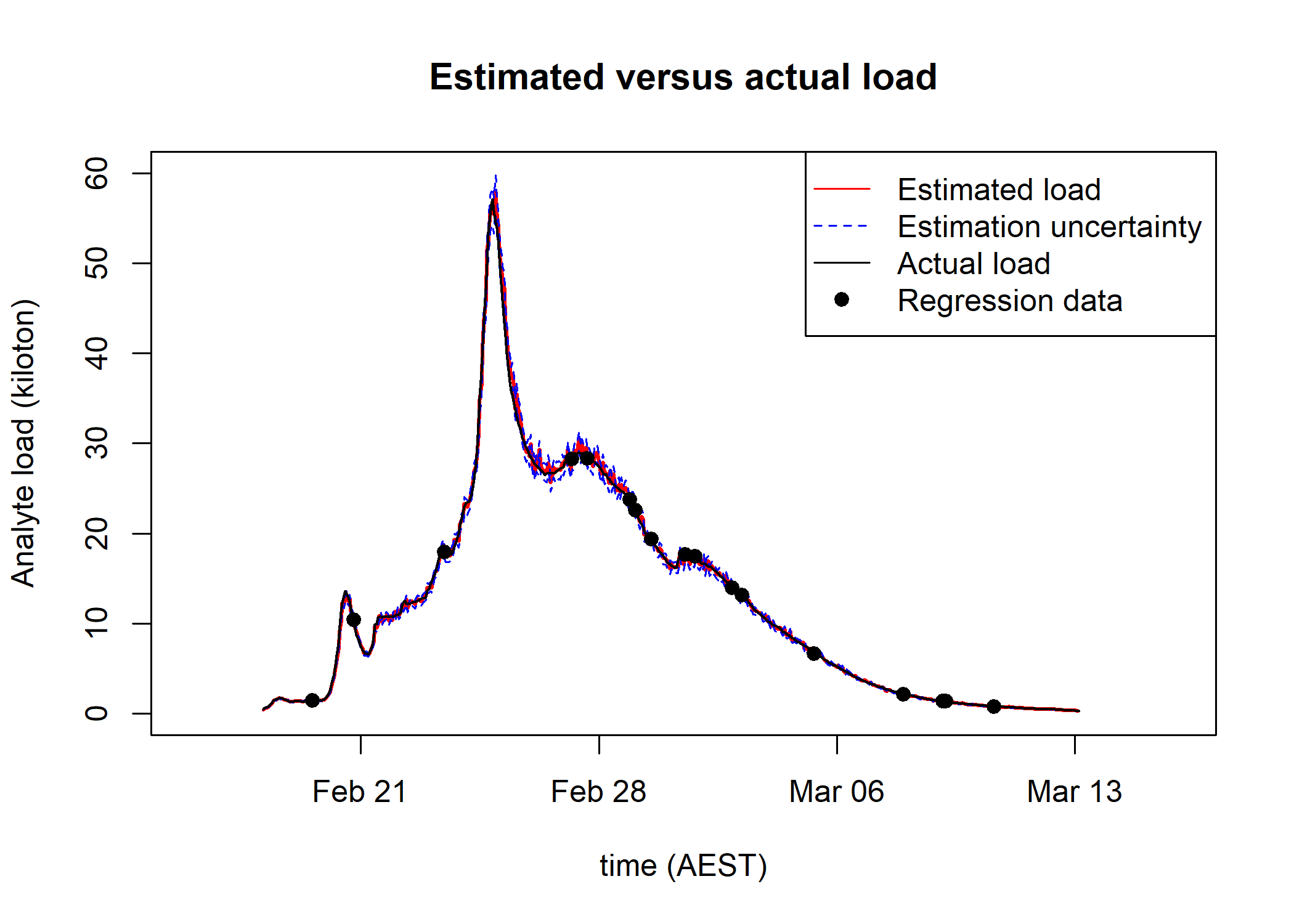 legend("topright",legend = c("Estimated load","Estimation uncertainty","Actual load","Regression data"),