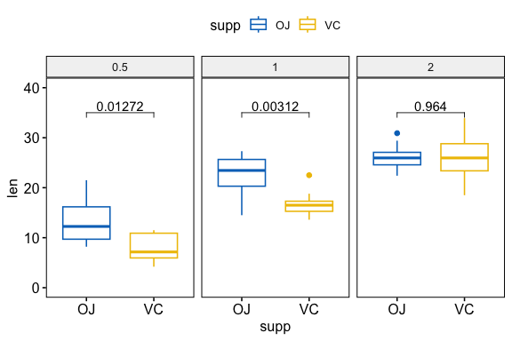 color = "supp", palette = "jco", ylim = c(0,40)
