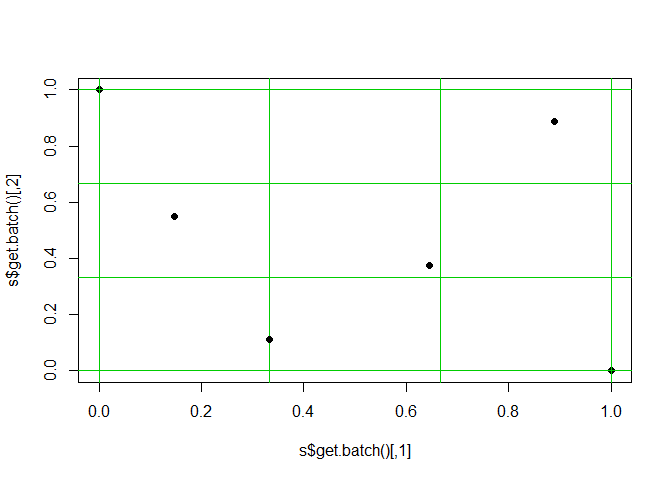 abline(h=(0:(s$Lb))/s$Lb,v=(0:(s$Lb))/s$Lb,col=3);points(s$get.batch(),pch=19)
