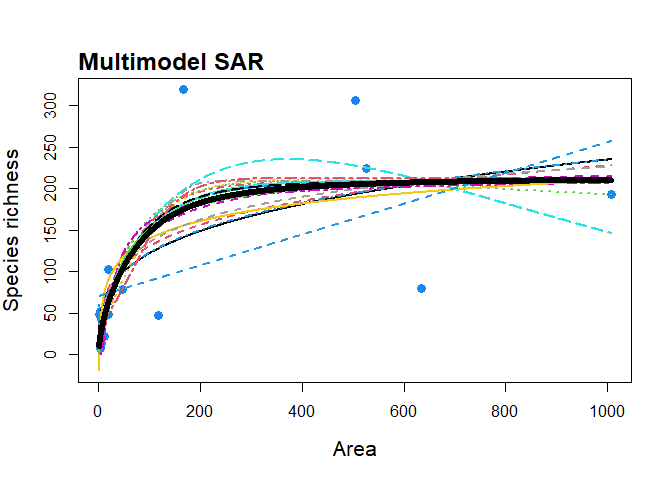 To fit a multimodel SAR curve to the ‘galapagos’ data set and plot it (alongside the individual model fits)