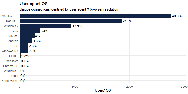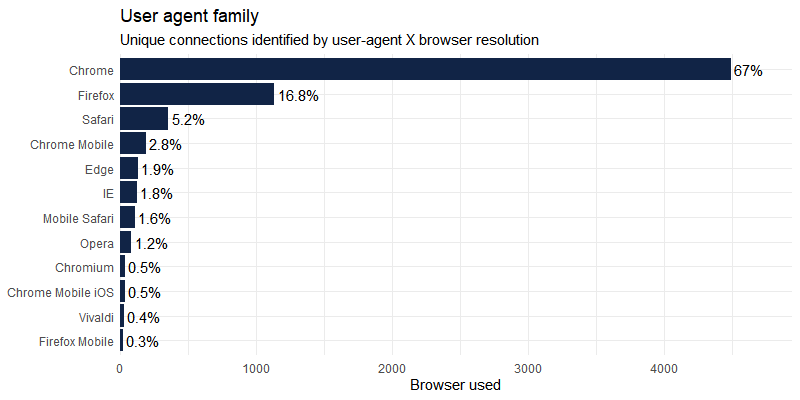 User-agent is recorded per connection and can be parsed with uaparserjs : (unique users are not registered as we use the open source version of shiny-server)